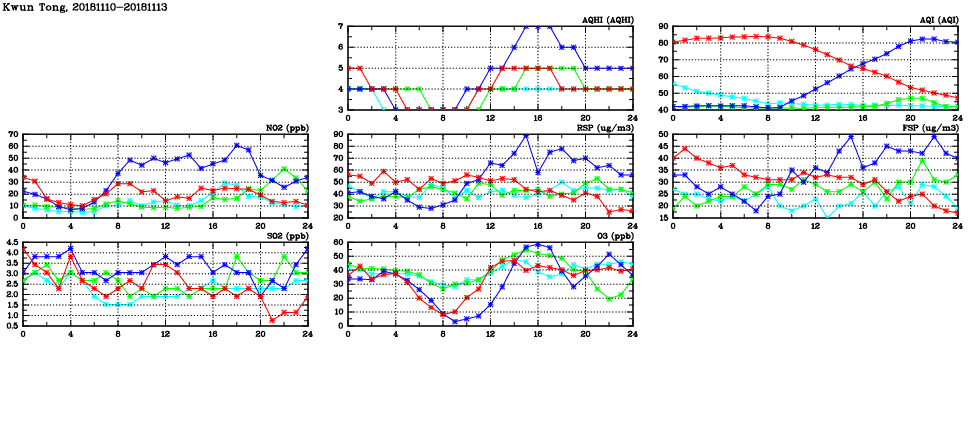 | Air Quality Data Time Series in Kwun Tong (2018/11/13) | ( Line colors: Day -3 Day -2 Day -1 Current day ) | 2D Map Current AQHI |
