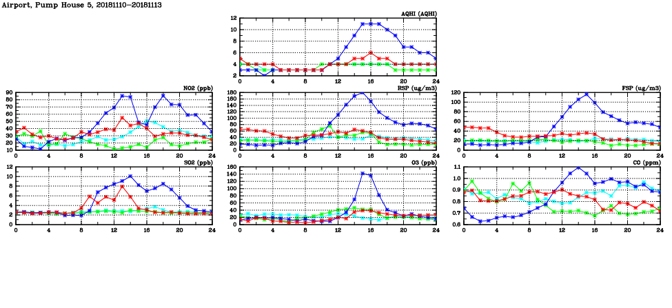| Air Quality Data Time Series in Airport, Pump House 5 (2018/11/13) | ( Line colors: Day -3 Day -2 Day -1 Current day ) | 2D Map Current AQHI |