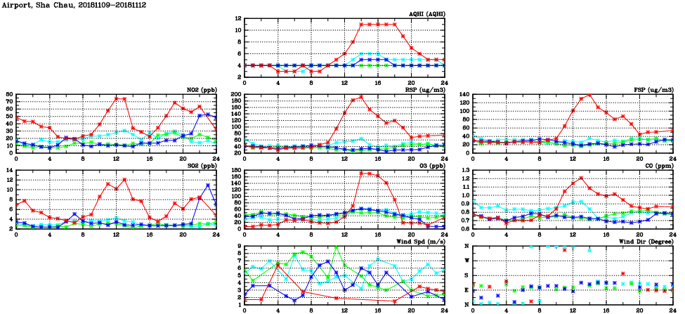| Air Quality Data Time Series in Airport, Sha Chau (2018/11/12) | ( Line colors: Day -3 Day -2 Day -1 Current day ) | 2D Map Current AQHI |