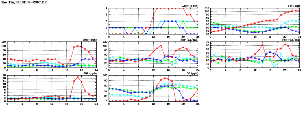 | Air Quality Data Time Series in Sha Tin (2018/11/12) | ( Line colors: Day -3 Day -2 Day -1 Current day ) | 2D Map Current AQHI |