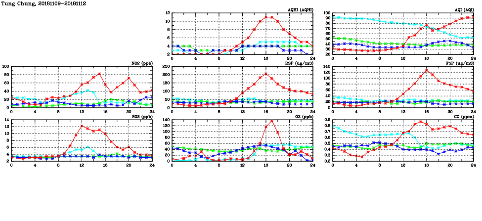 | Air Quality Data Time Series in Tung Chung (2018/11/12) | ( Line colors: Day -3 Day -2 Day -1 Current day ) | 2D Map Current AQHI |
