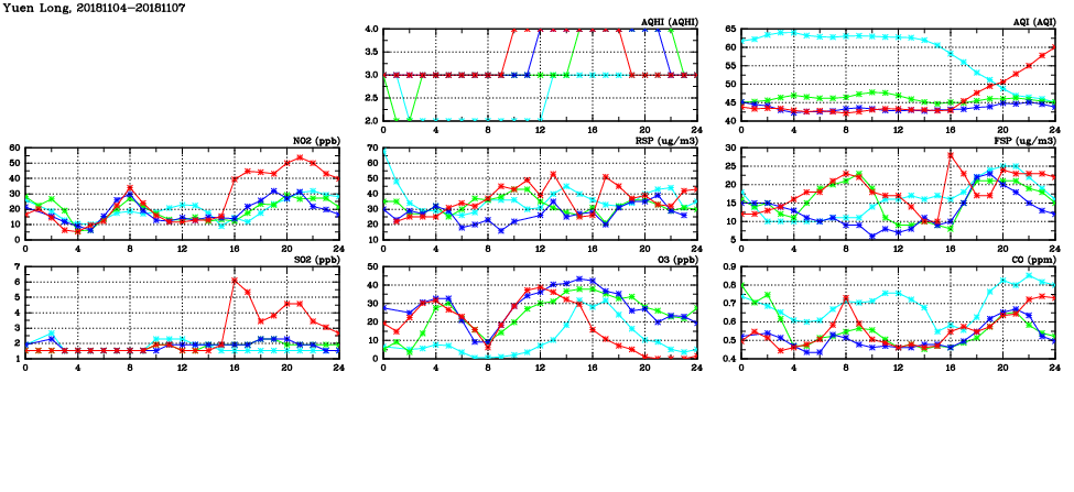 | Air Quality Data Time Series in Yuen Long (2018/11/07) | ( Line colors: Day -3 Day -2 Day -1 Current day ) | 2D Map Current AQHI |