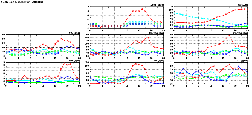 | Air Quality Data Time Series in Yuen Long (2018/11/12) | ( Line colors: Day -3 Day -2 Day -1 Current day ) | 2D Map Current AQHI |