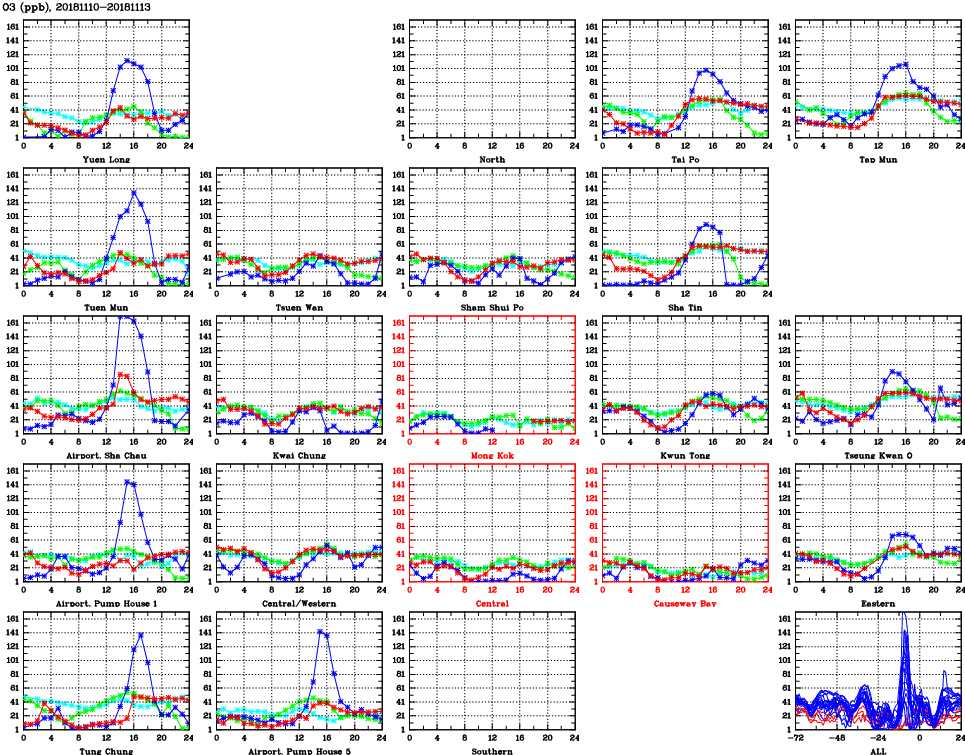 | Air Quality Data Time Series for O3 (2018/11/13) | ( Line colors: Day -3 Day -2 Day -1 Current day ) | 2D Map Current AQHI |