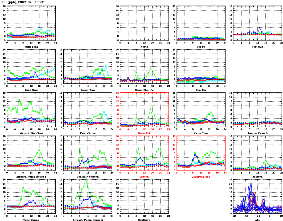 | Air Quality Data Time Series for SO2 (2018/11/10) | ( Line colors: Day -3 Day -2 Day -1 Current day ) | 2D Map Current AQHI |