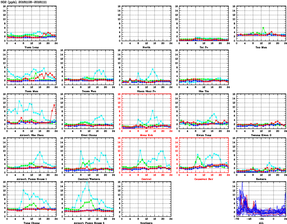 | Air Quality Data Time Series for SO2 (2018/11/11) | ( Line colors: Day -3 Day -2 Day -1 Current day ) | 2D Map Current AQHI |