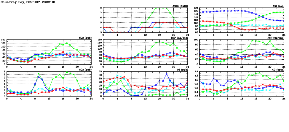| Air Quality Data Time Series in Causeway Bay (2018/11/10) | ( Line colors: Day -3 Day -2 Day -1 Current day ) | 2D Map Current AQHI |