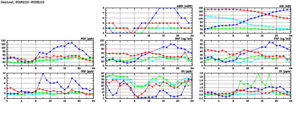 | Air Quality Data Time Series in Central (2018/11/13) | ( Line colors: Day -3 Day -2 Day -1 Current day ) | 2D Map Current AQHI |