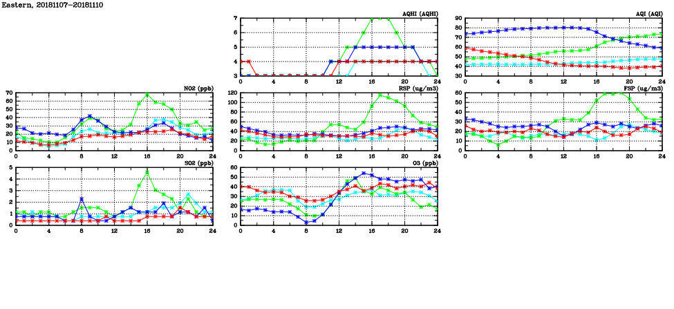 | Air Quality Data Time Series in Eastern (2018/11/10) | ( Line colors: Day -3 Day -2 Day -1 Current day ) | 2D Map Current AQHI |
