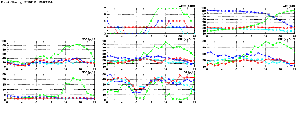 | Air Quality Data Time Series in Kwai Chung (2018/11/14) | ( Line colors: Day -3 Day -2 Day -1 Current day ) | 2D Map Current AQHI |