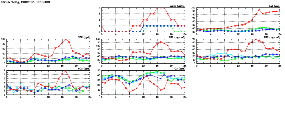 | Air Quality Data Time Series in Kwun Tong (2018/11/08) | ( Line colors: Day -3 Day -2 Day -1 Current day ) | 2D Map Current AQHI |