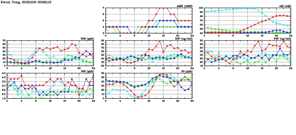 | Air Quality Data Time Series in Kwun Tong (2018/11/12) | ( Line colors: Day -3 Day -2 Day -1 Current day ) | 2D Map Current AQHI |