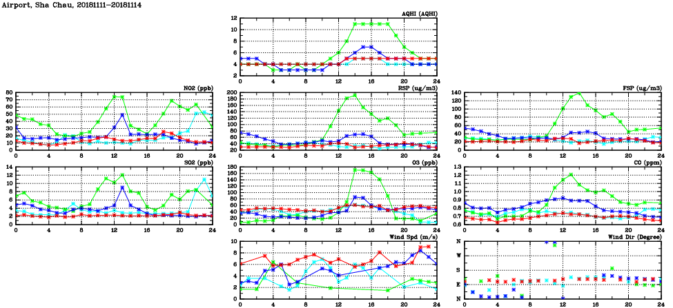| Air Quality Data Time Series in Airport, Sha Chau (2018/11/14) | ( Line colors: Day -3 Day -2 Day -1 Current day ) | 2D Map Current AQHI |