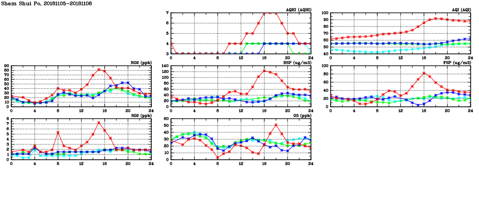 | Air Quality Data Time Series in Sham Shui Po (2018/11/08) | ( Line colors: Day -3 Day -2 Day -1 Current day ) | 2D Map Current AQHI |
