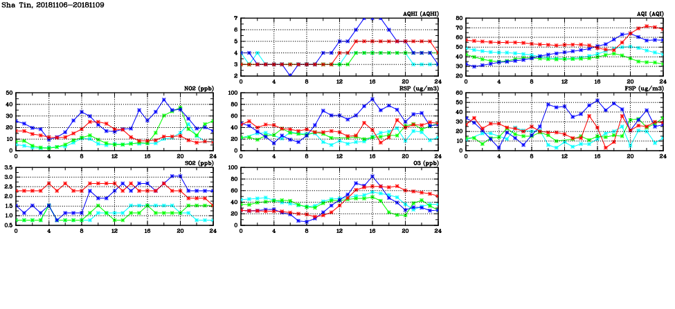 | Air Quality Data Time Series in Sha Tin (2018/11/09) | ( Line colors: Day -3 Day -2 Day -1 Current day ) | 2D Map Current AQHI |