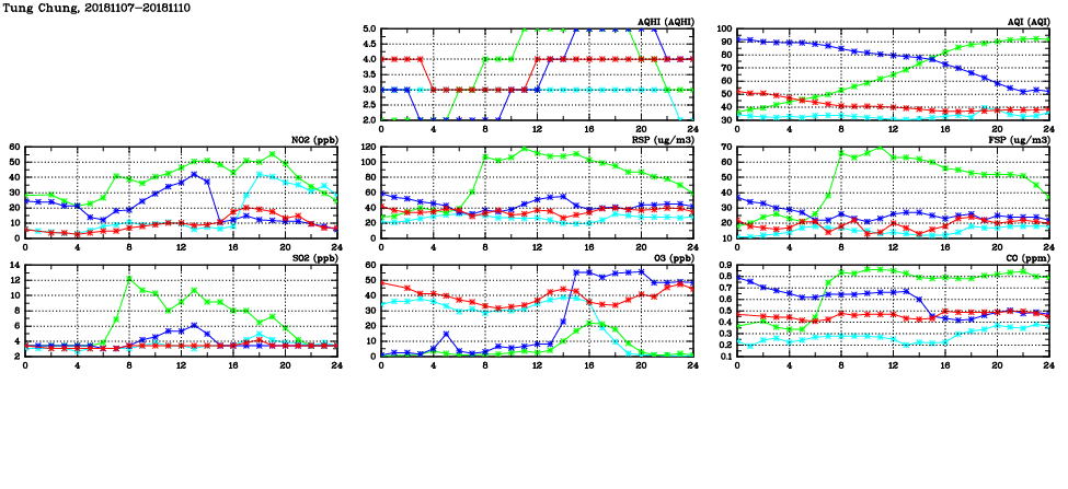 | Air Quality Data Time Series in Tung Chung (2018/11/10) | ( Line colors: Day -3 Day -2 Day -1 Current day ) | 2D Map Current AQHI |