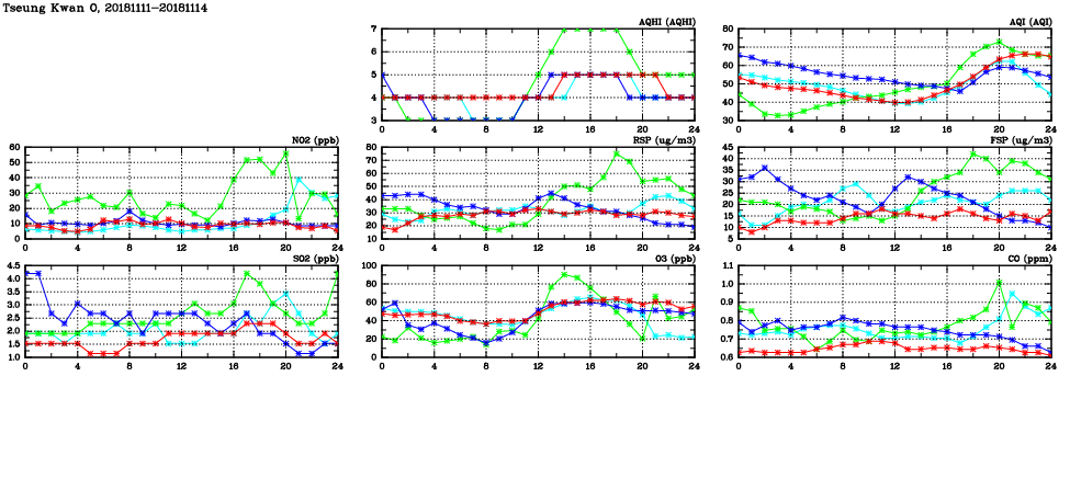 | Air Quality Data Time Series in Tseung Kwan O (2018/11/14) | ( Line colors: Day -3 Day -2 Day -1 Current day ) | 2D Map Current AQHI |