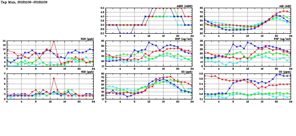 | Air Quality Data Time Series in Tap Mun (2018/11/09) | ( Line colors: Day -3 Day -2 Day -1 Current day ) | 2D Map Current AQHI |