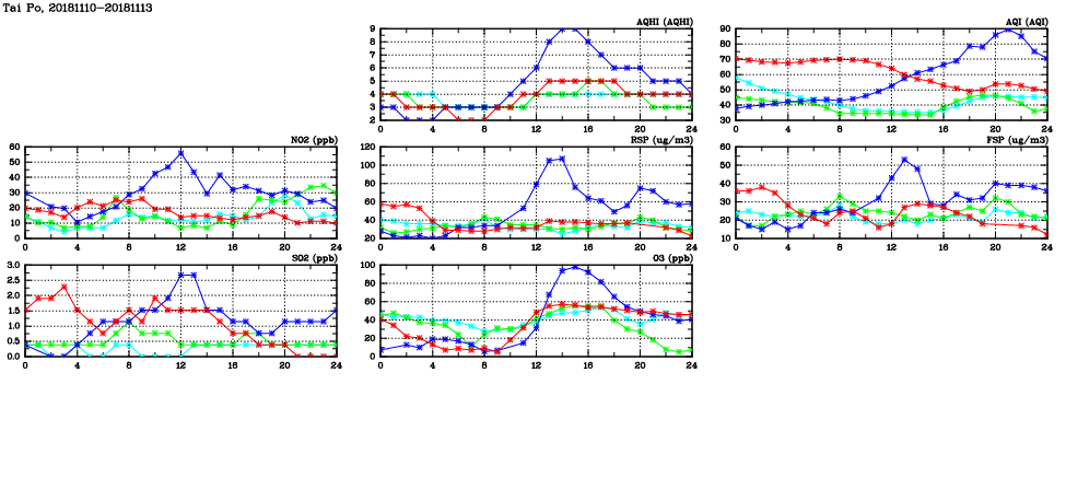 | Air Quality Data Time Series in Tai Po (2018/11/13) | ( Line colors: Day -3 Day -2 Day -1 Current day ) | 2D Map Current AQHI |