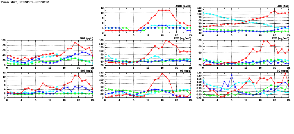 | Air Quality Data Time Series in Tuen Mun (2018/11/12) | ( Line colors: Day -3 Day -2 Day -1 Current day ) | 2D Map Current AQHI |
