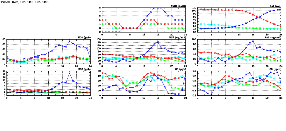 | Air Quality Data Time Series in Tsuen Wan (2018/11/13) | ( Line colors: Day -3 Day -2 Day -1 Current day ) | 2D Map Current AQHI |
