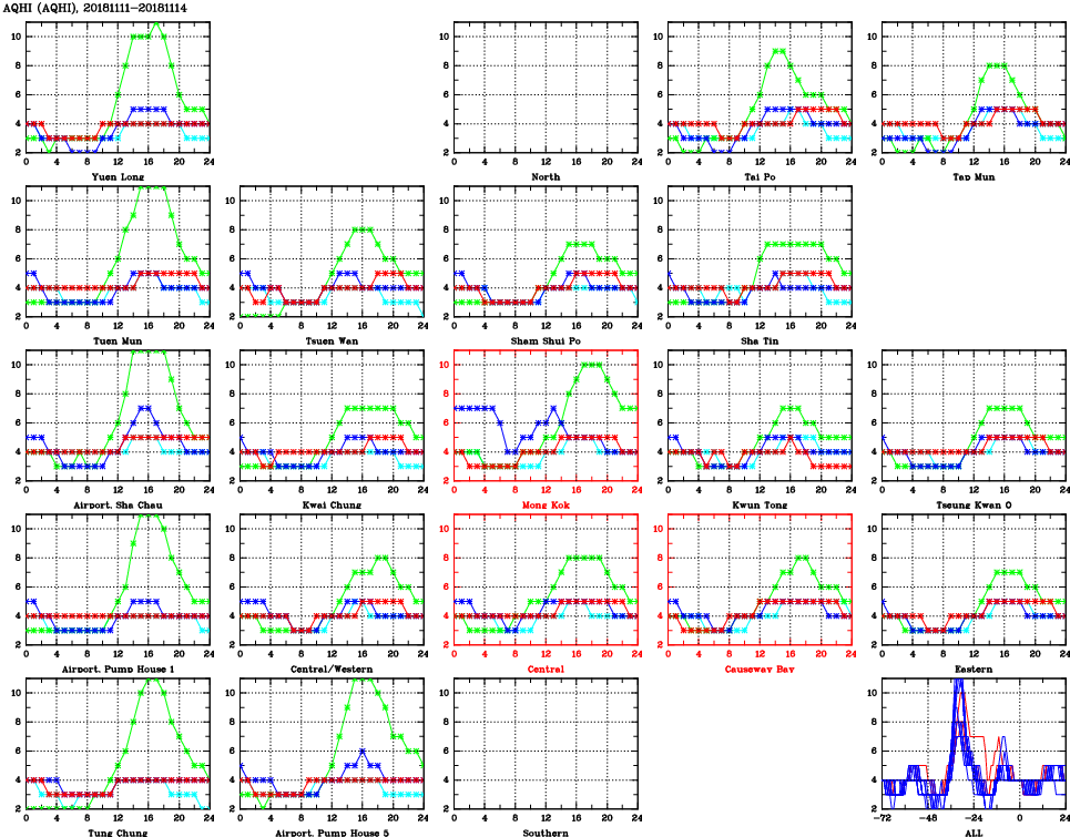 | Air Quality Data Time Series for AQHI (2018/11/14) | ( Line colors: Day -3 Day -2 Day -1 Current day ) | 2D Map Current AQHI |