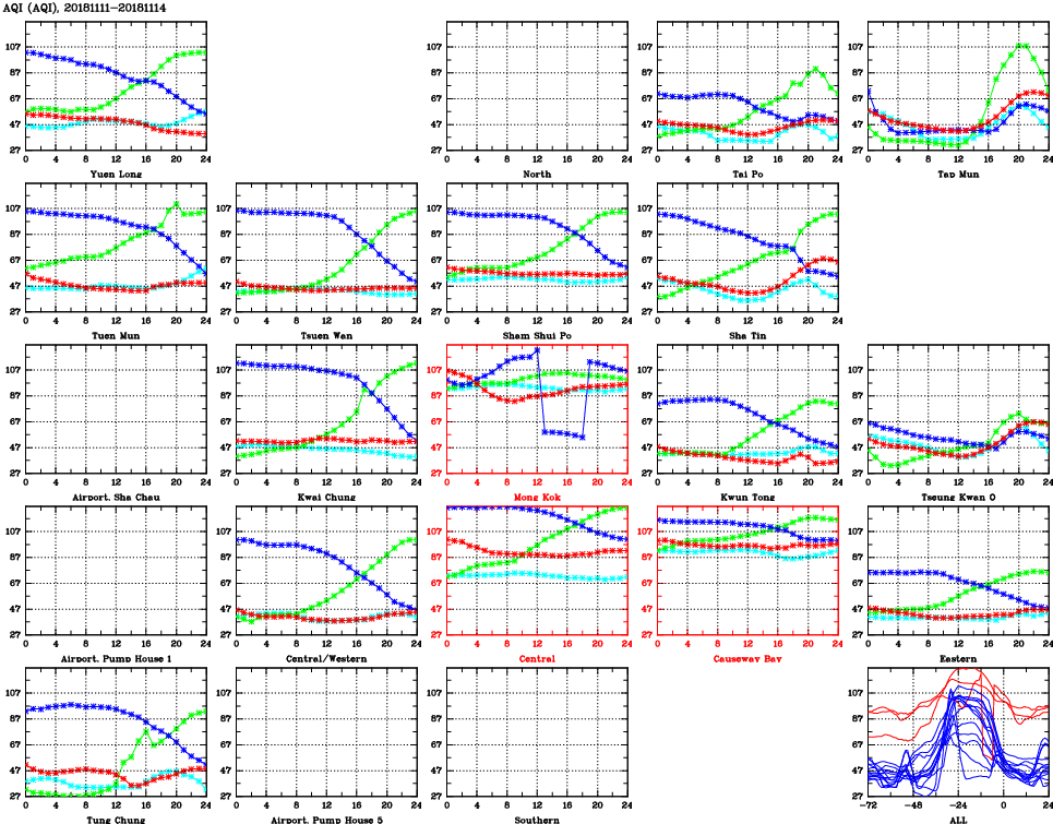 | Air Quality Data Time Series for AQI (2018/11/14) | ( Line colors: Day -3 Day -2 Day -1 Current day ) | 2D Map Current AQHI |