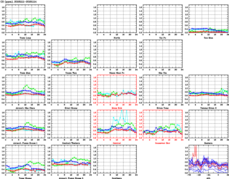 | Air Quality Data Time Series for CO (2018/11/14) | ( Line colors: Day -3 Day -2 Day -1 Current day ) | 2D Map Current AQHI |