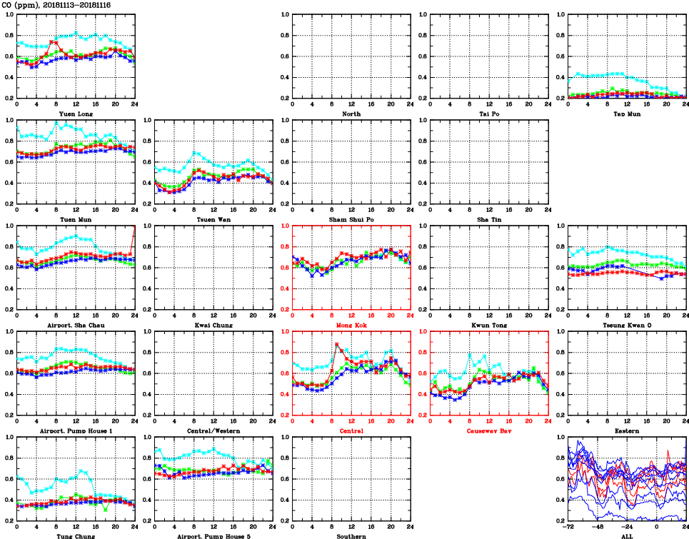 | Air Quality Data Time Series for CO (2018/11/16) | ( Line colors: Day -3 Day -2 Day -1 Current day ) | 2D Map Current AQHI |