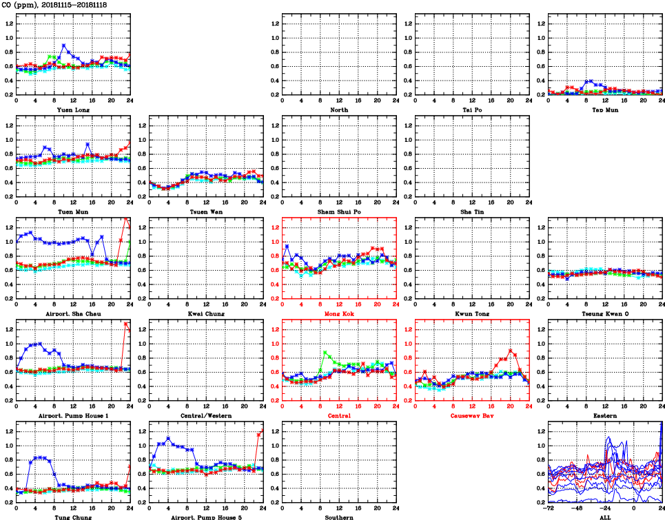 | Air Quality Data Time Series for CO (2018/11/18) | ( Line colors: Day -3 Day -2 Day -1 Current day ) | 2D Map Current AQHI |