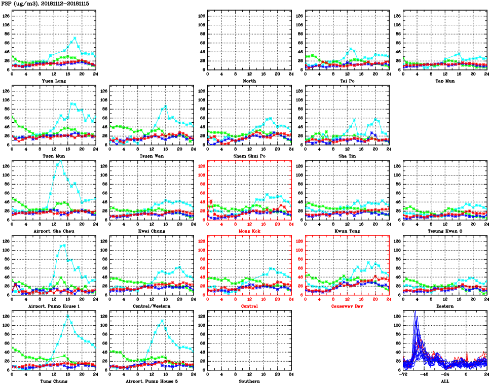 | Air Quality Data Time Series for FSP (2018/11/15) | ( Line colors: Day -3 Day -2 Day -1 Current day ) | 2D Map Current AQHI |
