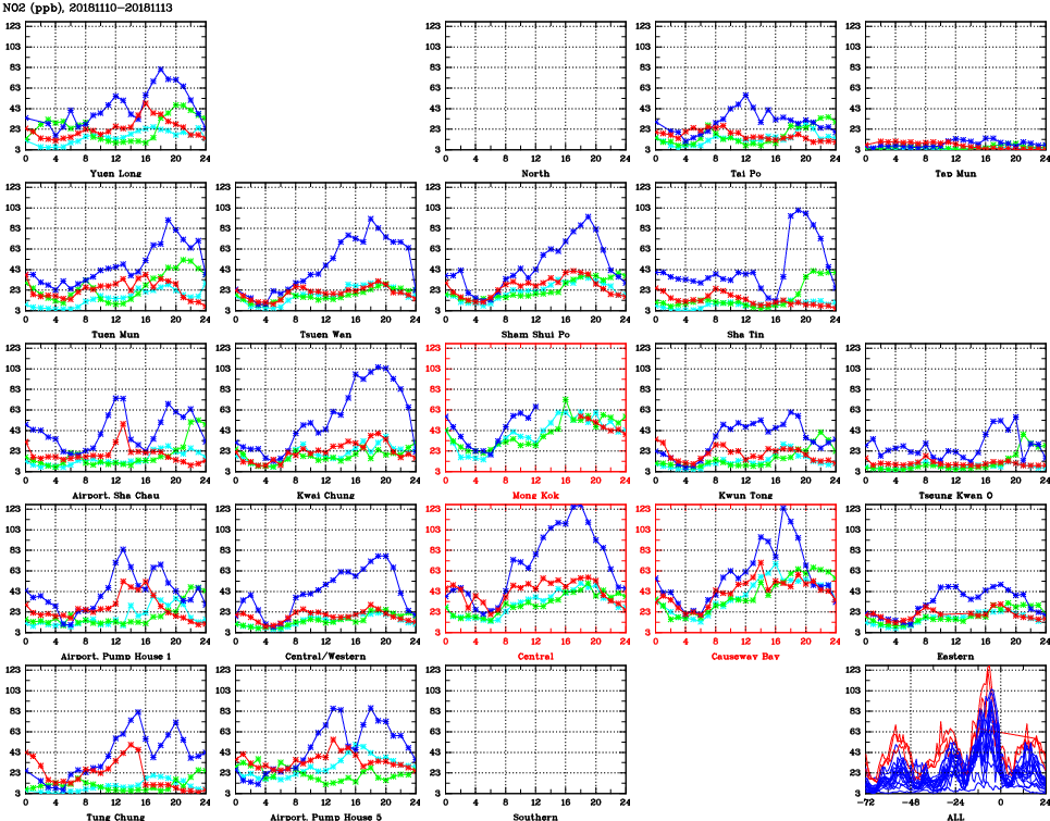 | Air Quality Data Time Series for NO2 (2018/11/13) | ( Line colors: Day -3 Day -2 Day -1 Current day ) | 2D Map Current AQHI |