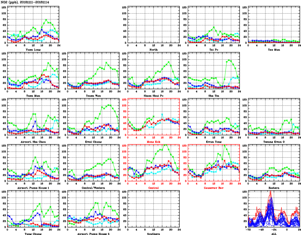 | Air Quality Data Time Series for NO2 (2018/11/14) | ( Line colors: Day -3 Day -2 Day -1 Current day ) | 2D Map Current AQHI |