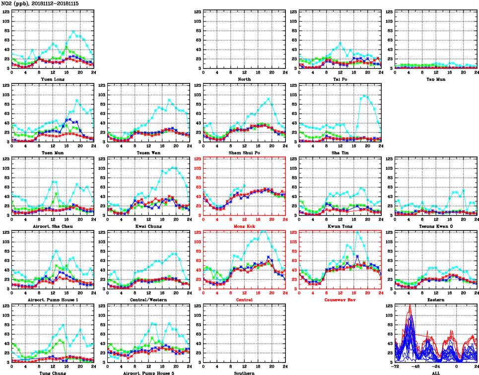 | Air Quality Data Time Series for NO2 (2018/11/15) | ( Line colors: Day -3 Day -2 Day -1 Current day ) | 2D Map Current AQHI |