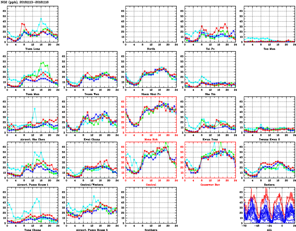 | Air Quality Data Time Series for NO2 (2018/11/16) | ( Line colors: Day -3 Day -2 Day -1 Current day ) | 2D Map Current AQHI |