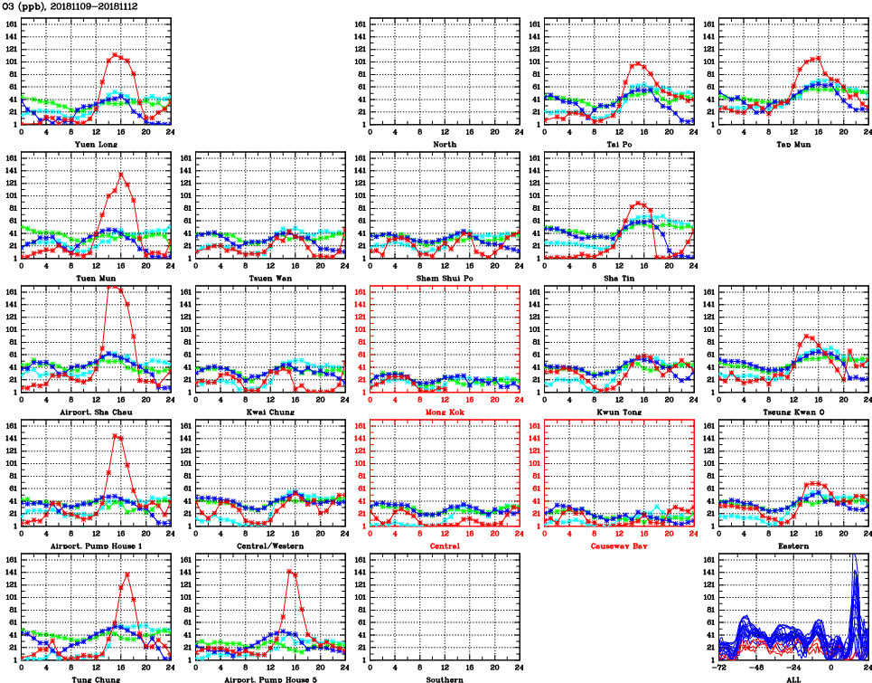 | Air Quality Data Time Series for O3 (2018/11/12) | ( Line colors: Day -3 Day -2 Day -1 Current day ) | 2D Map Current AQHI |