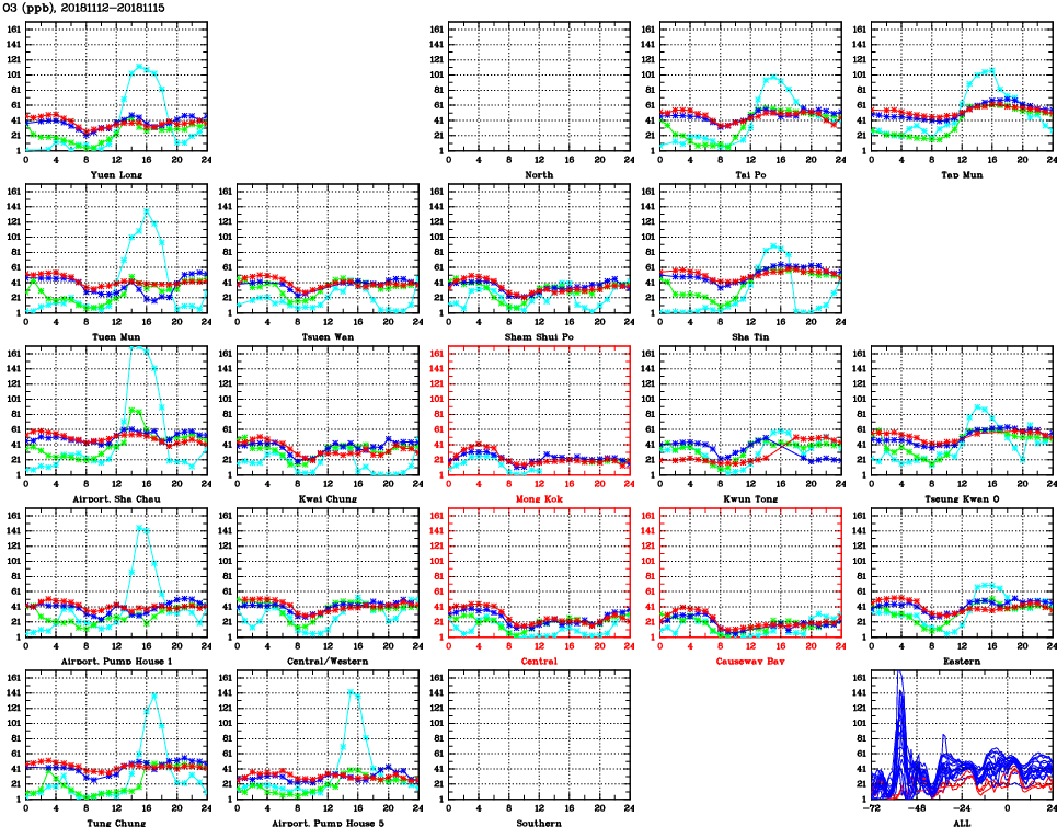 | Air Quality Data Time Series for O3 (2018/11/15) | ( Line colors: Day -3 Day -2 Day -1 Current day ) | 2D Map Current AQHI |