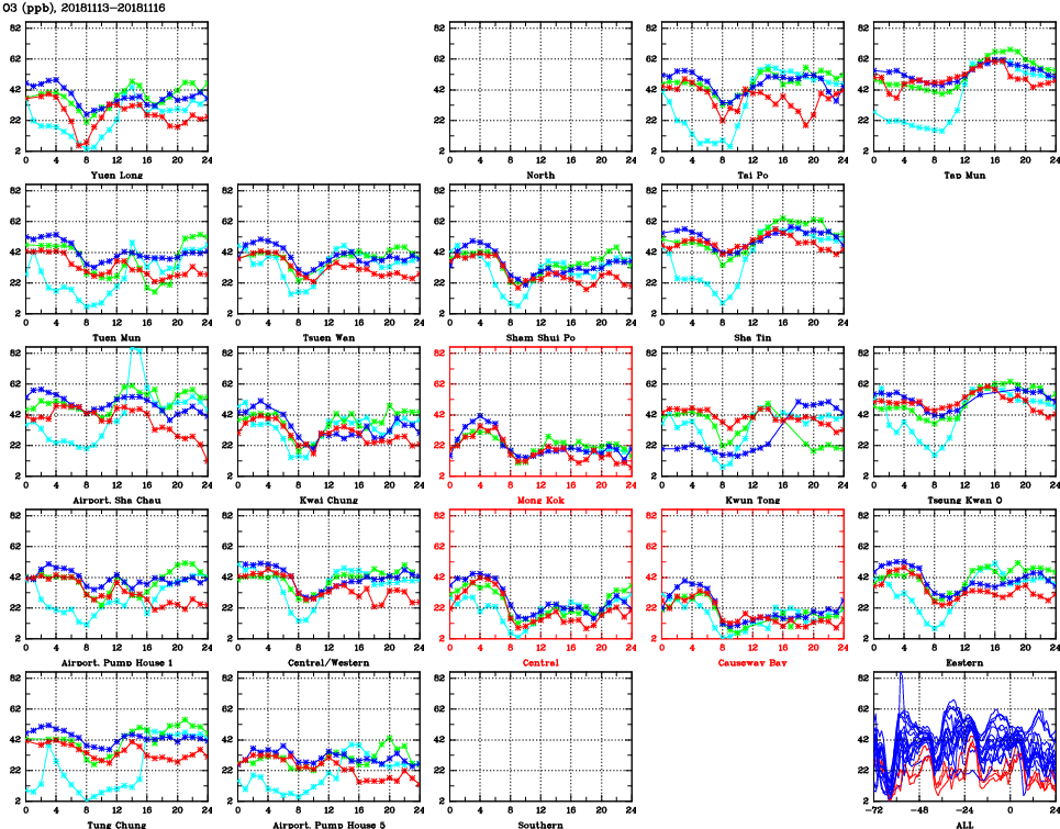Air Quality Data Time Series for O3 (2018/11/16) | ( Line colors: Day -3 Day -2 Day -1 Current day ) | 2D Map Current AQHI |
