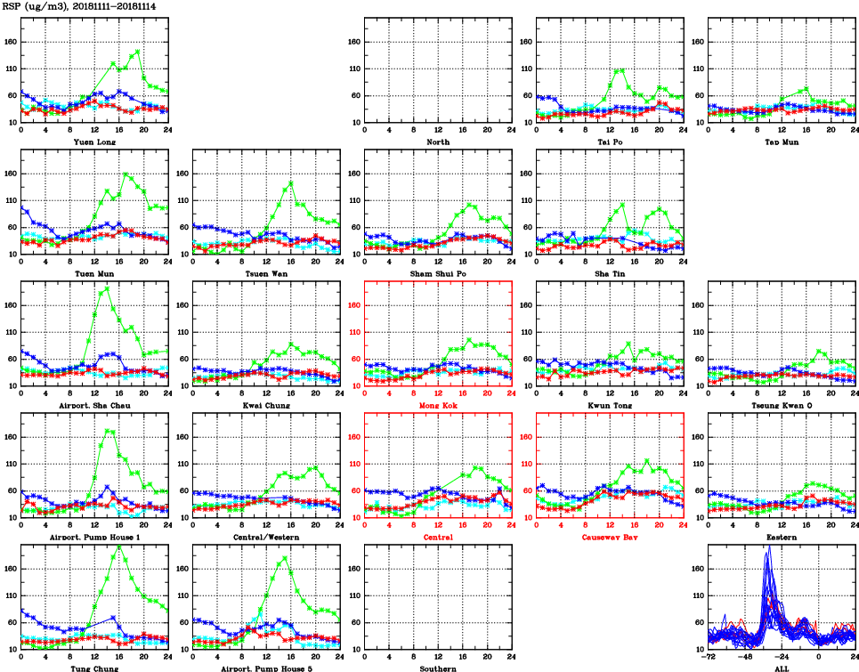 | Air Quality Data Time Series for RSP (2018/11/14) | ( Line colors: Day -3 Day -2 Day -1 Current day ) | 2D Map Current AQHI |