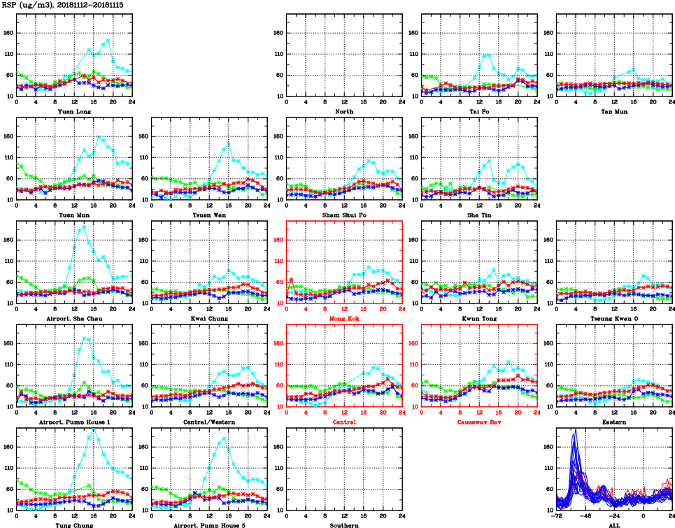 | Air Quality Data Time Series for RSP (2018/11/15) | ( Line colors: Day -3 Day -2 Day -1 Current day ) | 2D Map Current AQHI |