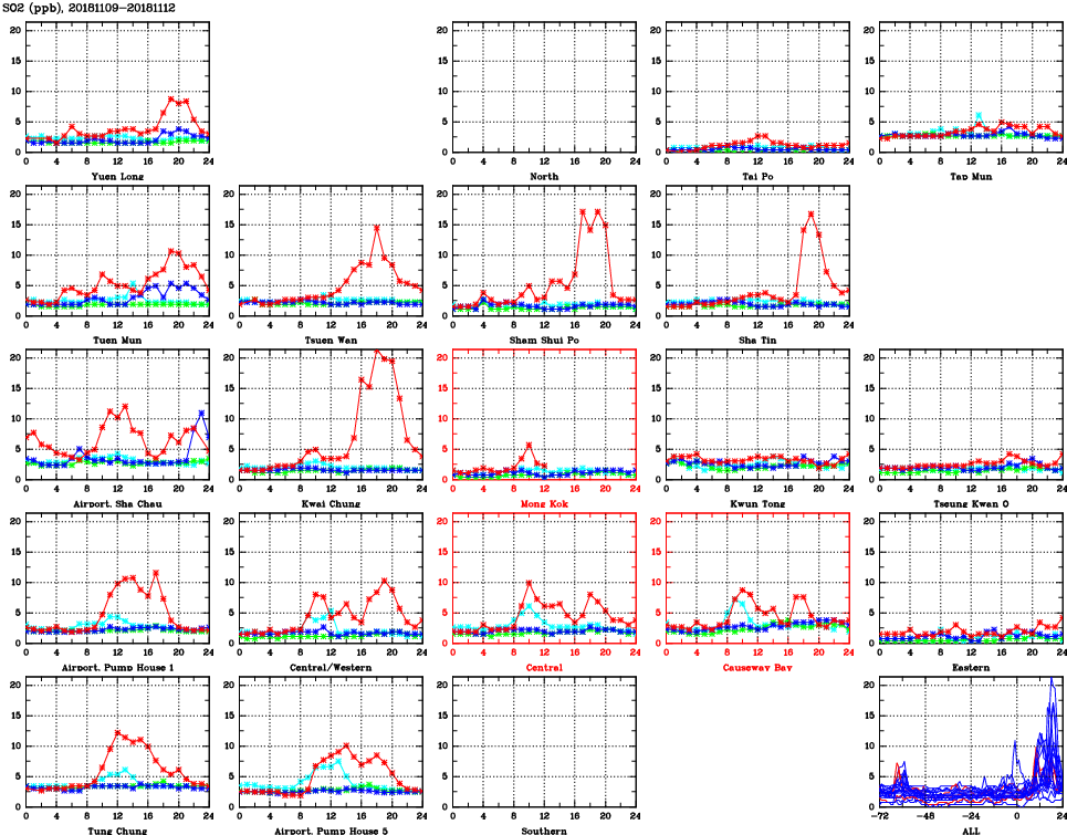 | Air Quality Data Time Series for SO2 (2018/11/12) | ( Line colors: Day -3 Day -2 Day -1 Current day ) | 2D Map Current AQHI |