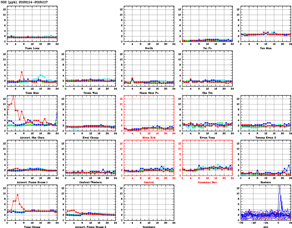| Air Quality Data Time Series for SO2 (2018/11/17) | ( Line colors: Day -3 Day -2 Day -1 Current day ) | 2D Map Current AQHI |