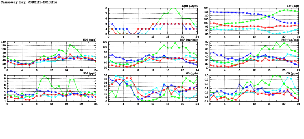 | Air Quality Data Time Series in Causeway Bay (2018/11/14) | ( Line colors: Day -3 Day -2 Day -1 Current day ) | 2D Map Current AQHI |