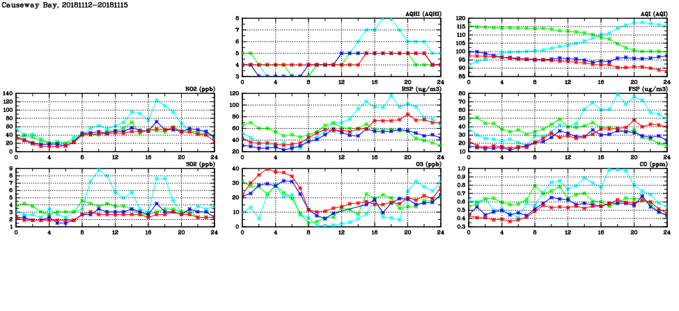 | Air Quality Data Time Series in Causeway Bay (2018/11/15) | ( Line colors: Day -3 Day -2 Day -1 Current day ) | 2D Map Current AQHI |