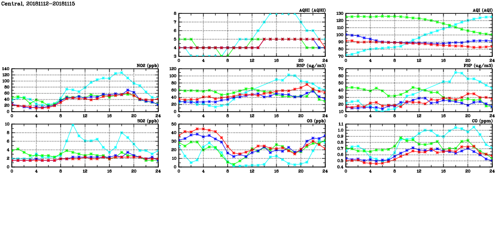 | Air Quality Data Time Series in Central (2018/11/15) | ( Line colors: Day -3 Day -2 Day -1 Current day ) | 2D Map Current AQHI |
