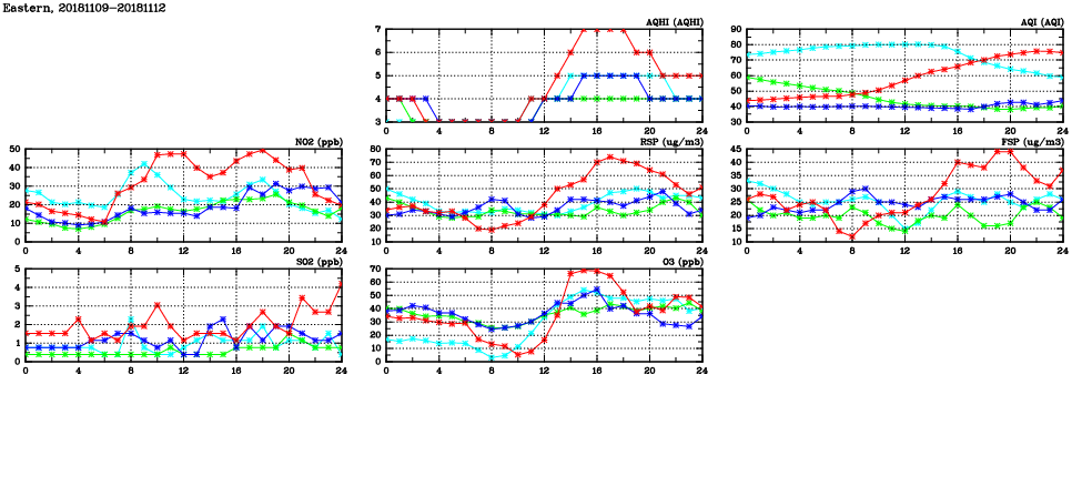 | Air Quality Data Time Series in Eastern (2018/11/12) | ( Line colors: Day -3 Day -2 Day -1 Current day ) | 2D Map Current AQHI |