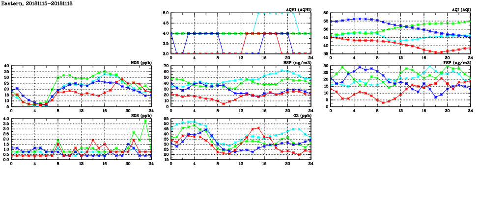 | Air Quality Data Time Series in Eastern (2018/11/18) | ( Line colors: Day -3 Day -2 Day -1 Current day ) | 2D Map Current AQHI |