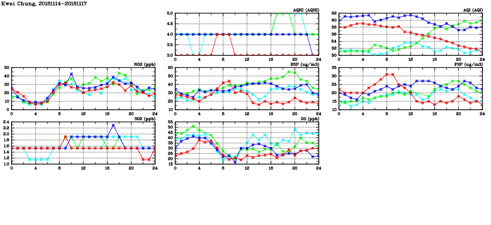 | Air Quality Data Time Series in Kwai Chung (2018/11/17) | ( Line colors: Day -3 Day -2 Day -1 Current day ) | 2D Map Current AQHI |