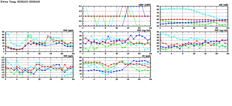 | Air Quality Data Time Series in Kwun Tong (2018/11/16) | ( Line colors: Day -3 Day -2 Day -1 Current day ) | 2D Map Current AQHI |