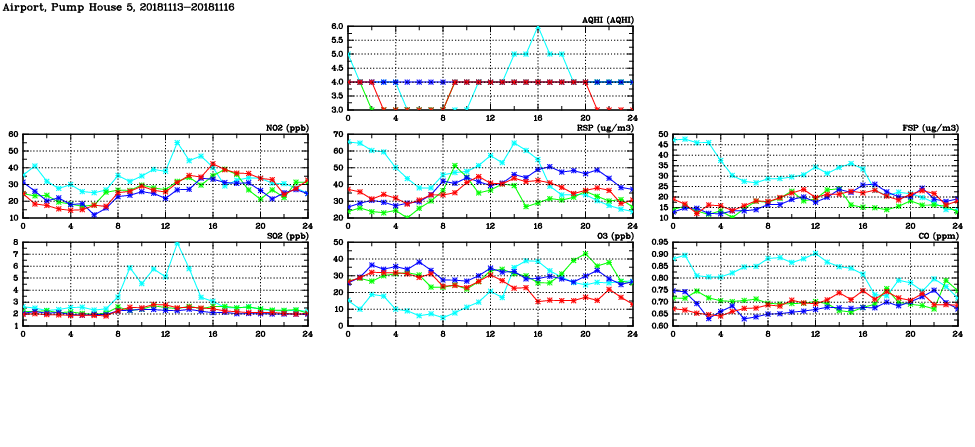 | Air Quality Data Time Series in Airport, Pump House 5 (2018/11/16) | ( Line colors: Day -3 Day -2 Day -1 Current day ) | 2D Map Current AQHI |